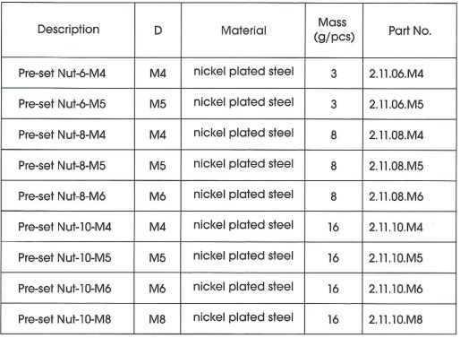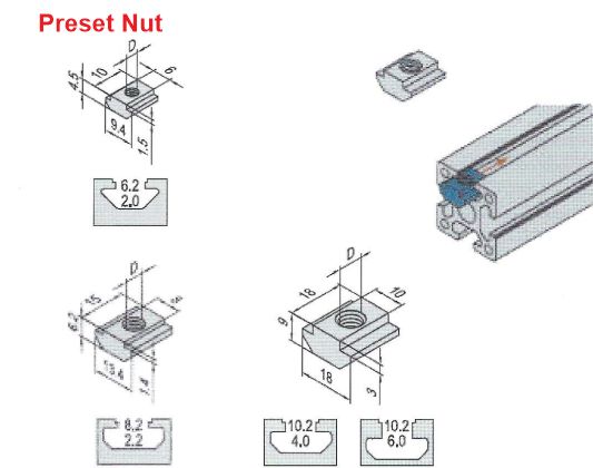 Preset Nut, T Nut, T Bolt